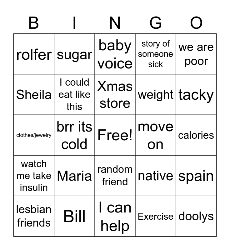 This bingo card has a free space and 24 words: Maria, Bill, Xmas store, lesbian friends, we are poor, rolfer, Sheila, sugar, move on, random friend, weight, clothes/jewelry, native, spain, I could eat like this, Exercise, calories, baby voice, tacky, brr its cold, doolys, watch me take insulin, story of someone sick and I can help.