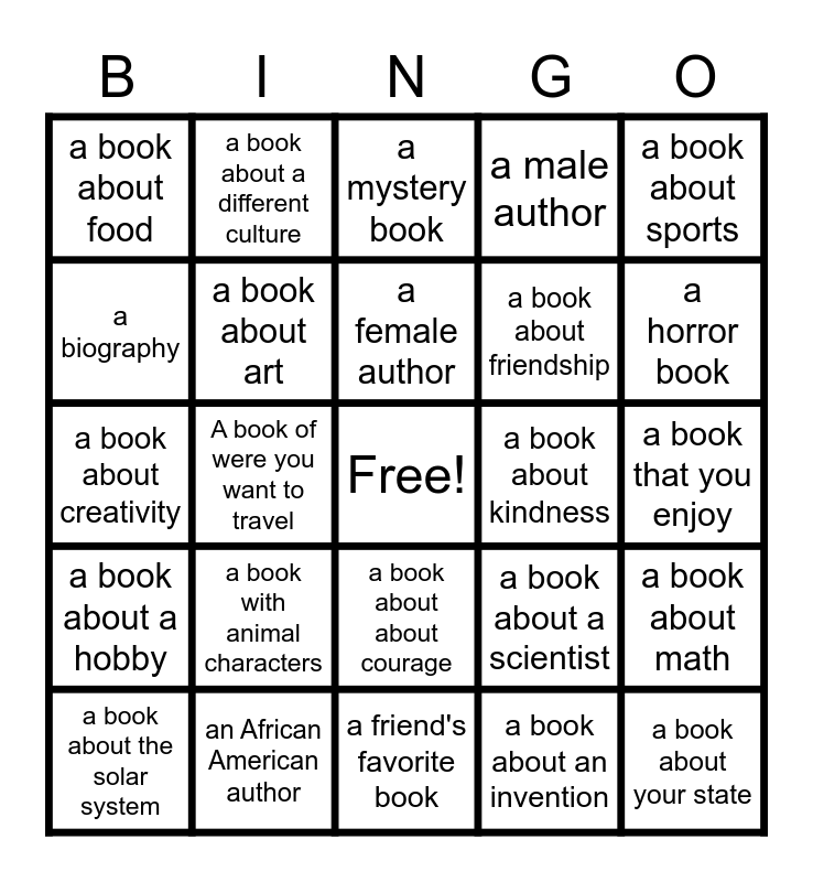 This bingo card has a free space and 24 words: a book with animal characters, an African American author, a female author, a book about the solar system, a book about sports, a book about food, a biography, a book about a different culture, a book about kindness, a book about about courage, a book about friendship, a book about creativity, a book about a scientist, a book about math, a book about art, a book about an invention, a book that you enjoy, a mystery book, a horror book, A book of were you want to travel, a book about your state, a book about a hobby, a male author and a friend's favorite book.