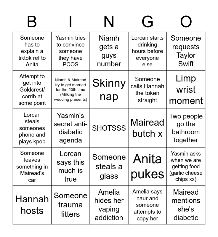 This bingo card has a free space and 24 words: Lorcan says this much is true, Someone trauma litters, Skinny nap, Hannah hosts, Someone requests Taylor Swift, Someone has to explain a tiktok ref to Anita, Attempt to get into Goldcrest/ corrib at some point, Yasmin tries to convince someone they have PCOS, Mairead butch x, Someone steals a glass, Someone calls Hannah the token straight, Lorcan steals someones phone and plays kpop, Anita pukes, Yasmin asks when we are getting food (garlic cheese chips xx), Niamh & Mairead try to get married for the 20th time (Milking the wedding presents), Amelia says naur and someone attempts to copy her, Two people go the bathroom together, Niamh gets a guys number, Limp wrist moment, Yasmin's secret anti-diabetic agenda, Mairead mentions she's diabetic, Someone leaves something in Mairead's car, Lorcan starts drinking hours before everyone else and Amelia hides her vaping addiction.