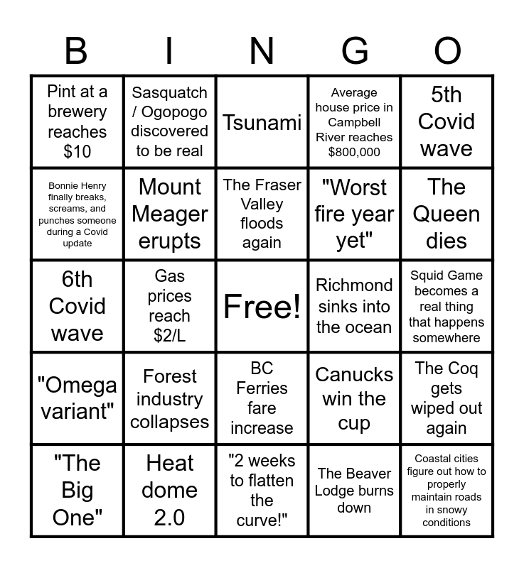 This bingo card has a free space and 24 words: Forest industry collapses, Heat dome 2.0, The Fraser Valley floods again, "The Big One", 5th Covid wave, Pint at a brewery reaches $10, Bonnie Henry finally breaks, screams, and punches someone during a Covid update, Sasquatch / Ogopogo discovered to be real, Richmond sinks into the ocean, BC Ferries fare increase, "Worst fire year yet", 6th Covid wave, Canucks win the cup, The Coq gets wiped out again, Mount Meager erupts, The Beaver Lodge burns down, Squid Game becomes a real thing that happens somewhere, Tsunami, The Queen dies, Gas prices reach $2/L, Coastal cities figure out how to properly maintain roads in snowy conditions, "Omega variant", Average house price in Campbell River reaches $800,000 and "2 weeks to flatten the curve!".