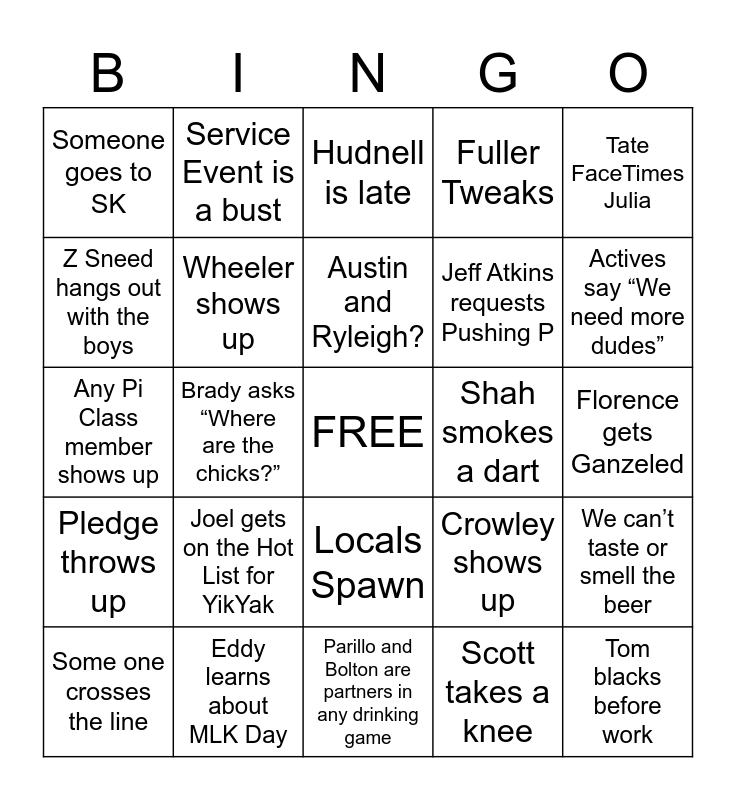 This bingo card has a free space and 24 words: Some one crosses the line, Joel gets on the Hot List for YikYak, Austin and Ryleigh?, Scott takes a knee, Tate FaceTimes Julia, Someone goes to SK, Service Event is a bust, Hudnell is late, Shah smokes a dart, Florence gets Ganzeled, Any Pi Class member shows up, Wheeler shows up, Crowley shows up, We can’t taste or smell the beer, Z Sneed hangs out with the boys, Eddy learns about MLK Day, Parillo and Bolton are partners in any drinking game, Fuller Tweaks, Actives say “We need more dudes”, Pledge throws up, Brady asks “Where are the chicks?”, Locals Spawn, Jeff Atkins requests Pushing P and Tom blacks before work.