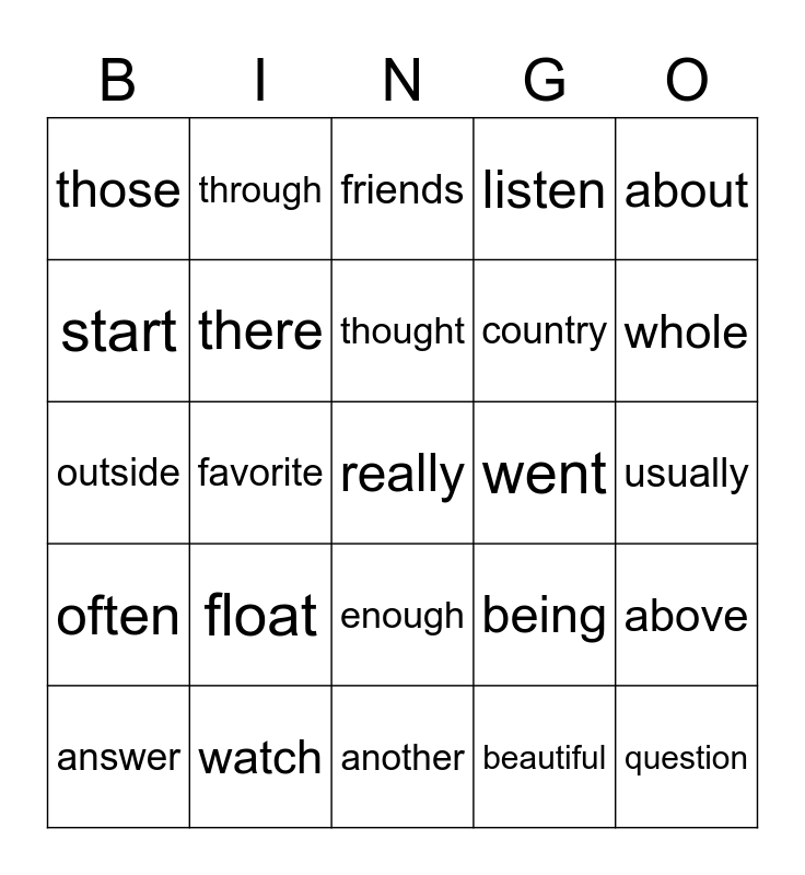 This bingo card has 25 words: float, another, thought, answer, about, those, start, through, went, enough, country, outside, being, above, there, question, usually, friends, whole, favorite, really, watch, often, listen and beautiful.