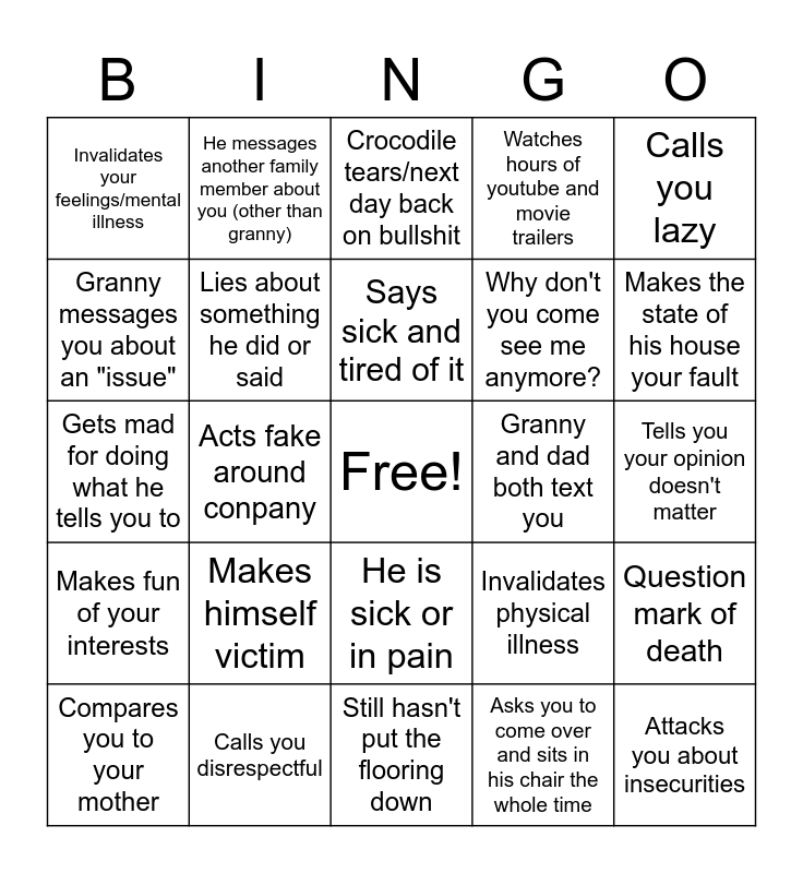 This bingo card has a free space and 24 words: Makes himself victim, Calls you disrespectful, Says sick and tired of it, Compares you to your mother, Calls you lazy, Invalidates your feelings/mental illness, Granny messages you about an "issue", He messages another family member about you (other than granny), Granny and dad both text you, He is sick or in pain, Why don't you come see me anymore?, Gets mad for doing what he tells you to, Invalidates physical illness, Question mark of death, Lies about something he did or said, Asks you to come over and sits in his chair the whole time, Tells you your opinion doesn't matter, Crocodile tears/next day back on bullshit, Makes the state of his house your fault, Acts fake around conpany, Attacks you about insecurities, Makes fun of your interests, Watches hours of youtube and movie trailers and Still hasn't put the flooring down.