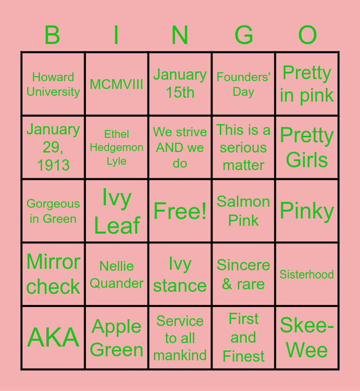 This bingo card has a free space and 29 words: AKA, 1908, Ivy Leaf, 20 Pearls, Howard University, January 15th, Ethel Hedgemon Lyle, Nellie Quander, Salmon Pink, Apple Green, Pinky, Skee-Wee, Service to all mankind, First and Finest, Pretty Girls, We help each other, Ivy stance, Mirror check, Pretty in pink, Gorgeous in Green, Sincere & rare, By culture & merit, This is a serious matter, January 29, 1913, Founders' Day, MCMVIII, Sisterhood, We strive AND we do and 3 time imitated, never duplicated.