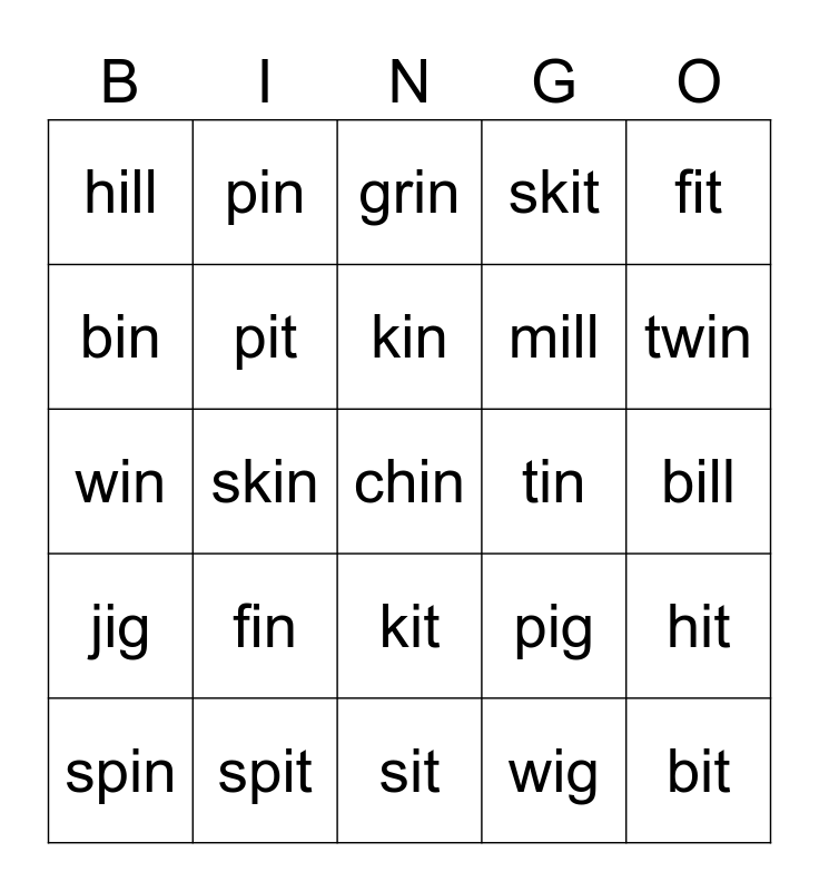 This bingo card has 25 words: fin, sit, kin, spin, fit, hill, bin, pin, tin, kit, mill, win, pig, hit, pit, bit, bill, grin, twin, skin, chin, spit, jig, skit and wig.