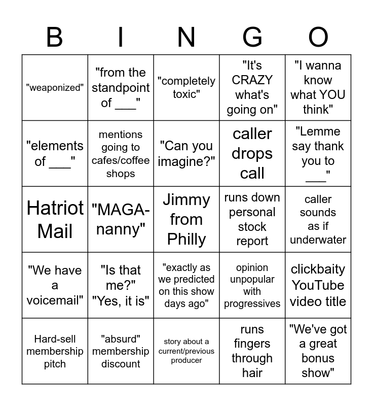 This bingo card has a free space and 24 words: Hard-sell membership pitch, "Is that me?" "Yes, it is", "Can you imagine?", runs fingers through hair, "I wanna know what YOU think", "weaponized", "from the standpoint of ___", "completely toxic", runs down personal stock report, caller sounds as if underwater, Hatriot Mail, mentions going to cafes/coffee shops, opinion unpopular with progressives, clickbaity YouTube video title, "elements of ___", "absurd" membership discount, story about a current/previous producer, "It's CRAZY what's going on", "Lemme say thank you to ___", "We have a voicemail", "MAGA-nanny", "exactly as we predicted on this show days ago", caller drops call and "We've got a great bonus show".