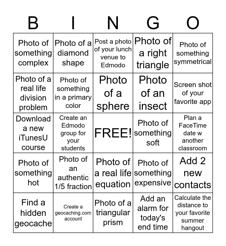 This bingo card has a free space and 24 words: Photo of an authentic 1/5 fraction, Create a geocaching.com account, Photo of a sphere, Find a hidden geocache, Photo of something symmetrical, Photo of something complex, Photo of a real life division problem, Photo of a diamond shape, Photo of something soft, Photo of a real life equation, Photo of an insect, Download a new iTunesU course, Photo of something expensive, Add 2 new contacts, Photo of something in a primary color, Add an alarm for today's end time, Plan a FaceTime date w another classroom, Post a photo of your lunch venue to Edmodo, Screen shot of your favorite app, Create an Edmodo group for your students, Calculate the distance to your favorite summer hangout, Photo of something hot, Photo of a right triangle and Photo of a triangular prism.
