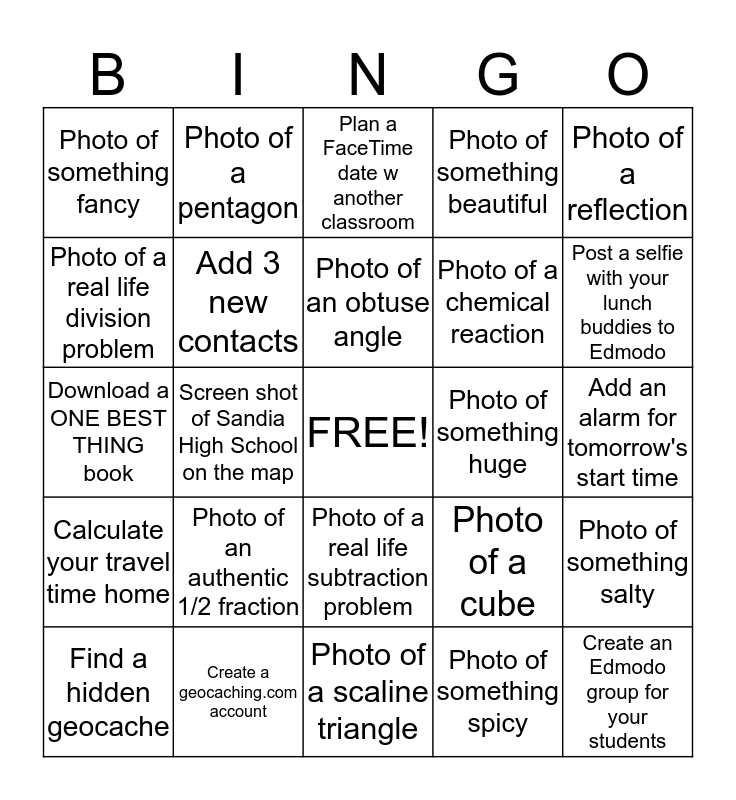 This bingo card has a free space and 24 words: Photo of an authentic 1/2 fraction, Create a geocaching.com account, Photo of an obtuse angle, Find a hidden geocache, Photo of a reflection, Photo of something fancy, Photo of a real life division problem, Photo of a pentagon, Photo of something huge, Photo of a real life subtraction problem, Photo of a chemical reaction, Download a ONE BEST THING book, Photo of a cube, Photo of something salty, Add 3 new contacts, Photo of something spicy, Add an alarm for tomorrow's start time, Plan a FaceTime date w another classroom, Post a selfie with your lunch buddies to Edmodo, Screen shot of Sandia High School on the map, Create an Edmodo group for your students, Calculate your travel time home, Photo of something beautiful and Photo of a scaline triangle.