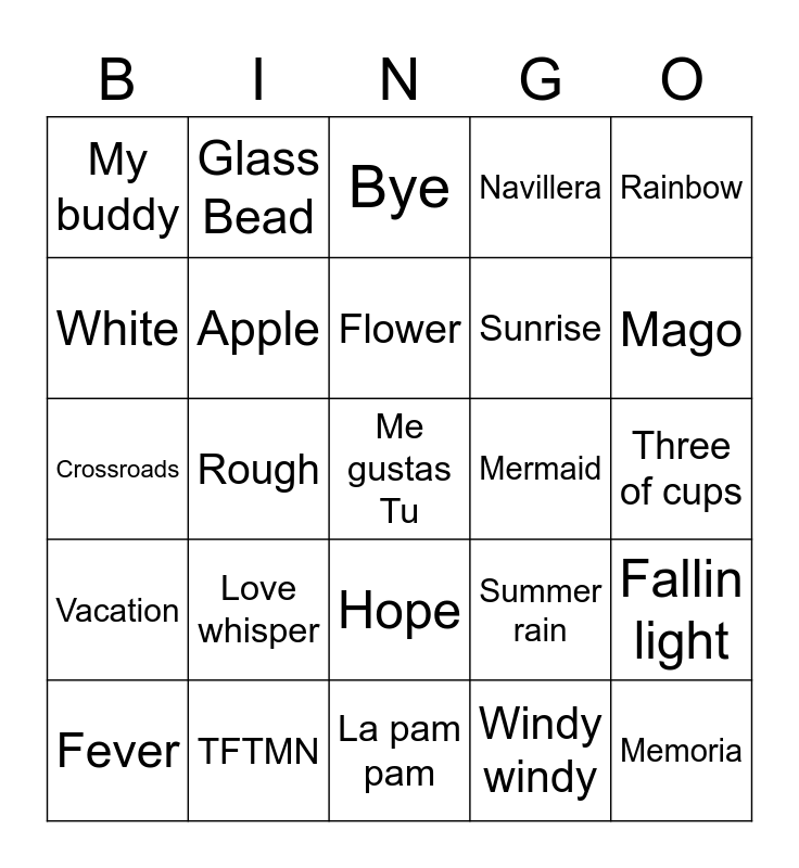 This bingo card has a free space and 24 words: Love whisper, TFTMN, Flower, Fever, Rainbow, My buddy, White, Glass Bead, Mermaid, Hope, Sunrise, Crossroads, Summer rain, Fallin light, Apple, Windy windy, Three of cups, Bye, Mago, Rough, Memoria, Vacation, Navillera and La pam pam.