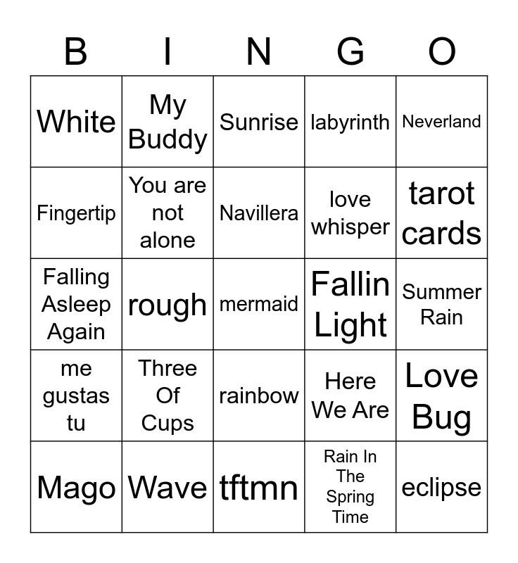 This bingo card has a free space and 24 words: Mago, Three Of Cups, Navillera, Rain In The Spring Time, Neverland, White, My Buddy, Sunrise, Fallin Light, Summer Rain, Falling Asleep Again, You are not alone, Here We Are, Love Bug, Fingertip, Wave, tftmn, labyrinth, tarot cards, me gustas tu, rough, rainbow, love whisper and eclipse.