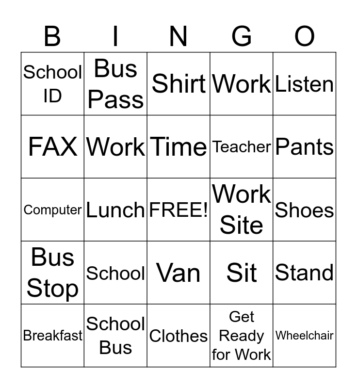 This bingo card has a free space and 24 words: School, School Bus, Time, Breakfast, Listen, School ID, FAX, Bus Pass, Work Site, Van, Teacher, Computer, Sit, Stand, Work, Get Ready for Work, Shoes, Shirt, Pants, Lunch, Wheelchair, Bus Stop, Work and Clothes.