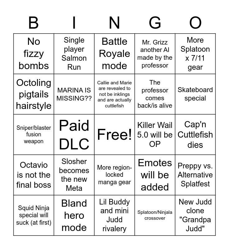 This bingo card has a free space and 24 words: Slosher becomes the new Meta, Bland hero mode, Callie and Marie are revealed to not be inklings and are actually cuttlefish, Squid Ninja special will suck (at first), More Splatoon x 7/11 gear, No fizzy bombs, Octoling pigtails hairstyle, Single player Salmon Run, Killer Wail 5.0 will be OP, More region-locked manga gear, The professor comes back/is alive, Sniper/blaster fusion weapon, Emotes will be added, Preppy vs. Alternative Splatfest, MARINA IS MISSING??, Splatoon/Ninjala crossover, Cap'n Cuttlefish dies, Battle Royale mode, Skateboard special, Paid DLC, New Judd clone "Grandpa Judd", Octavio is not the final boss, Mr. Grizz another AI made by the professor and Lil Buddy and mini Judd rivalery.
