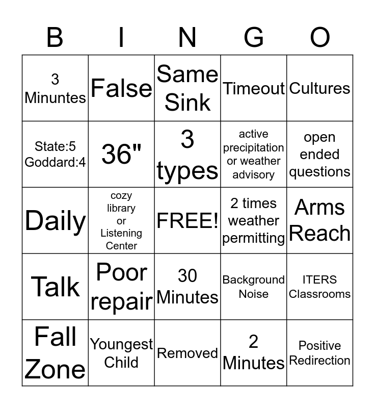 This bingo card has a free space and 24 words: Poor repair, Youngest Child, 3 types, Fall Zone, Cultures, 3 Minuntes, State:5 Goddard:4, False, 2 times weather permitting, 30 Minutes, active precipitation or weather advisory, Daily, Background Noise, ITERS Classrooms, 36", 2 Minutes, Arms Reach, Same Sink, open ended questions, cozy library or Listening Center, Positive Redirection, Talk, Timeout and Removed.