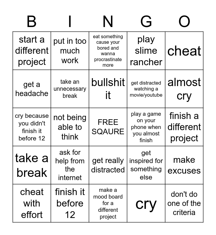 This bingo card has a free space and 34 words: get discouraged, cry, laugh + cry, laugh + cry + give up, take a break, take an unnecessary break, cheat, cheat with effort, put in too much work, wing it, bullshit it, eat something cause your bored and wanna procrastinate more, listen to music you don't know to focus better, get sidetracked for a very long time, play a game on your phone when you almost finish, almost cry, finish it before 12, cry because you didn't finish it before 12, ask for help from the internet, get inspired for something else, get really distracted, play episode, start a different project, finish a different project, make a mood board for a different project, don't do one of the criteria, play slime rancher, download CC, get distracted watching a movie/youtube, get a headache, cry because of the headache, not being able to think, make excuses and another free space.