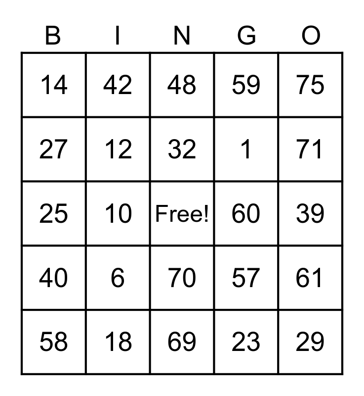 This bingo card has a free space and 24 words: 6, 18, 32, 58, 75, 14, 27, 42, 60, 70, 1, 25, 57, 61, 12, 23, 39, 48, 71, 10, 29, 40, 59 and 69.