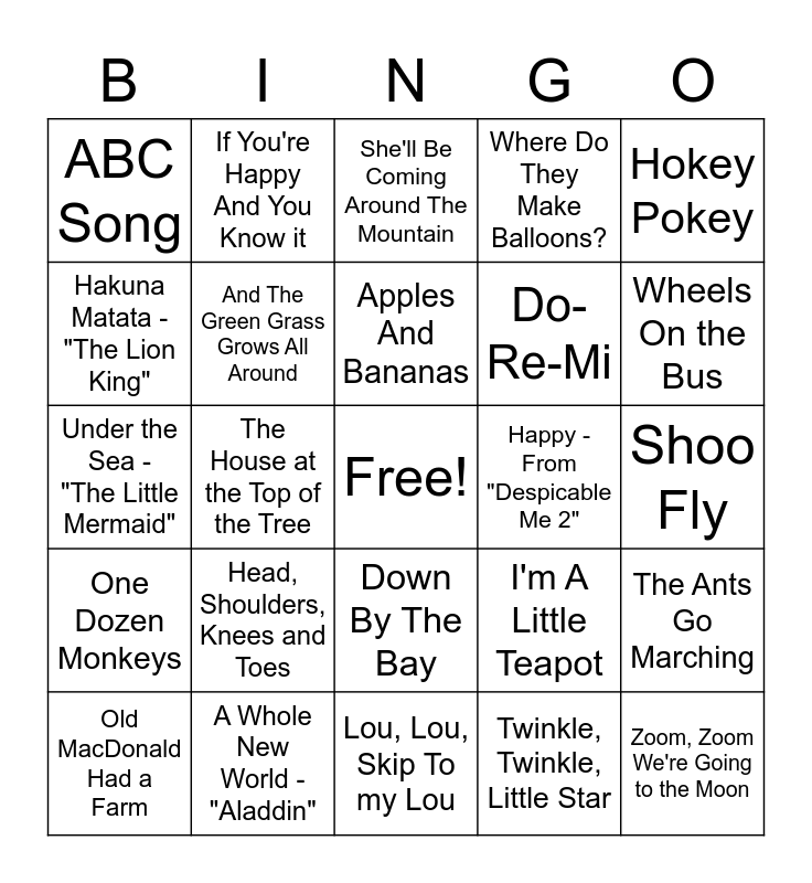 This bingo card has a free space and 39 words: Baby Shark, Row Row Your Boat, Itsy Bitsy Spider, And The Green Grass Grows All Around, Old MacDonald Had a Farm, Down By The Bay, Apples And Bananas, The Grand Old Duke of York, Hokey Pokey, One Dozen Monkeys, The House at the Top of the Tree, Where Do They Make Balloons?, Zoom, Zoom We're Going to the Moon, Shoo Fly, Happy - From "Despicable Me 2", Head, Shoulders, Knees and Toes, If All The Raindrops, ABC Song, Bingo, I'm A Little Teapot, Hakuna Matata - "The Lion King", Lou, Lou, Skip To my Lou, Do-Re-Mi, Wheels On the Bus, Do Your Ears Hang Low?, ABE Phonics Song, On Top of Spaghetti, Bicycle Built for Two, Skidamarink, If You're Happy And You Know it, Mr. Sun, 5 Little Ducks, She'll Be Coming Around The Mountain, A Whole New World - "Aladdin", Twinkle, Twinkle, Little Star, Pop! Goes the Weasle, The Ants Go Marching, Under the Sea - "The Little Mermaid" and Friend Like Me.