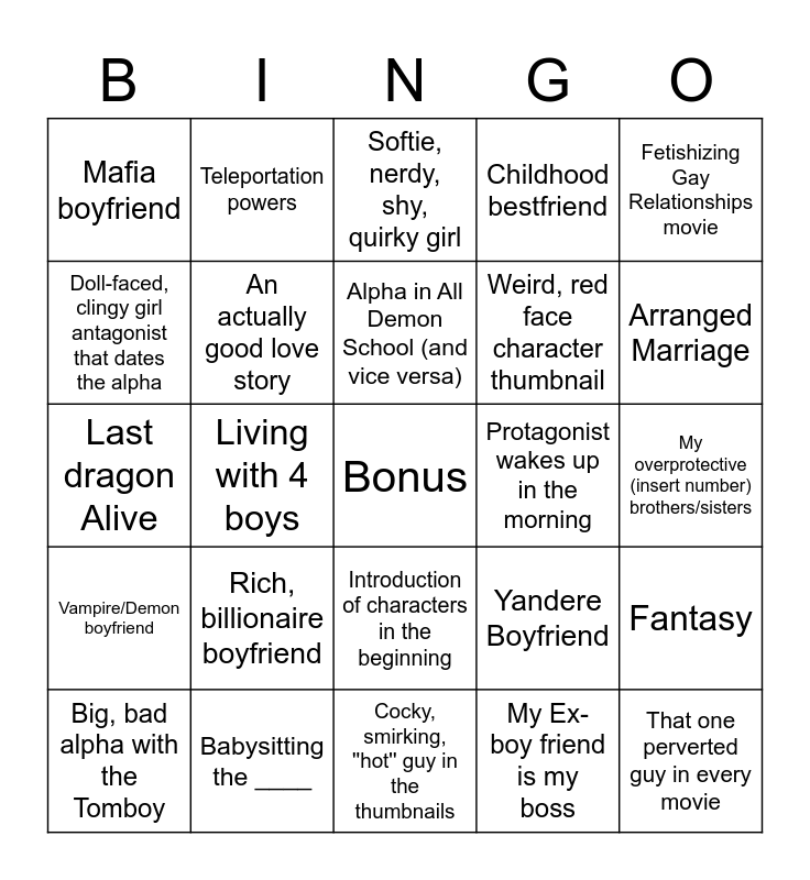 This bingo card has a free space and 24 words: Rich, billionaire boyfriend, Babysitting the ____, Alpha in All Demon School (and vice versa), Big, bad alpha with the Tomboy, Fetishizing Gay Relationships movie, Mafia boyfriend, Doll-faced, clingy girl antagonist that dates the alpha, Teleportation powers, Protagonist wakes up in the morning, Introduction of characters in the beginning, Weird, red face character thumbnail, Last dragon Alive, Yandere Boyfriend, Fantasy, An actually good love story, My Ex-boy friend is my boss, My overprotective (insert number) brothers/sisters, Softie, nerdy, shy, quirky girl, Arranged Marriage, Living with 4 boys, That one perverted guy in every movie, Vampire/Demon boyfriend, Childhood bestfriend and Cocky, smirking, ''hot'' guy in the thumbnails.