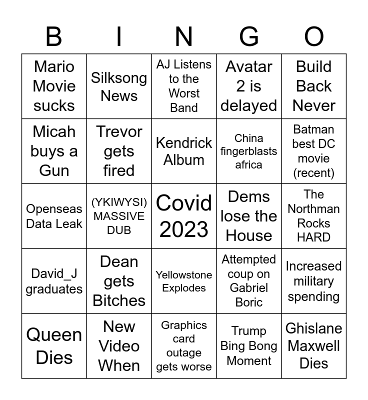 This bingo card has a free space and 24 words: Dean gets Bitches, New Video When, Kendrick Album, Queen Dies, Build Back Never, Mario Movie sucks, Micah buys a Gun, Silksong News, Dems lose the House, Yellowstone Explodes, China fingerblasts africa, Openseas Data Leak, Attempted coup on Gabriel Boric, Increased military spending, Trevor gets fired, Trump Bing Bong Moment, The Northman Rocks HARD, AJ Listens to the Worst Band, Batman best DC movie (recent), (YKIWYSI) MASSIVE DUB, Ghislane Maxwell Dies, David_J graduates, Avatar 2 is delayed and Graphics card outage gets worse.