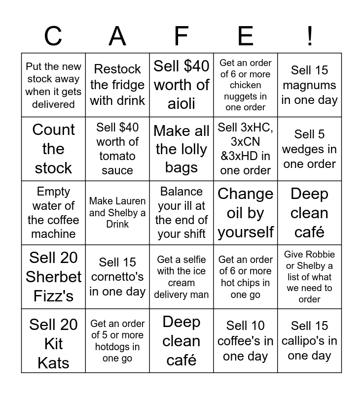 This bingo card has a free space and 24 words: Sell 15 cornetto's in one day, Get an order of 5 or more hotdogs in one go, Make all the lolly bags, Sell 20 Kit Kats, Sell 15 magnums in one day, Put the new stock away when it gets delivered, Count the stock, Restock the fridge with drink, Change oil by yourself, Get a selfie with the ice cream delivery man, Sell 3xHC, 3xCN &3xHD in one order, Empty water of the coffee machine, Get an order of 6 or more hot chips in one go, Give Robbie or Shelby a list of what we need to order, Sell $40 worth of tomato sauce, Sell 10 coffee's in one day, Deep clean café, Sell $40 worth of aioli, Sell 5 wedges in one order, Make Lauren and Shelby a Drink, Sell 15 callipo's in one day, Sell 20 Sherbet Fizz's, Get an order of 6 or more chicken nuggets in one order and Deep clean café.