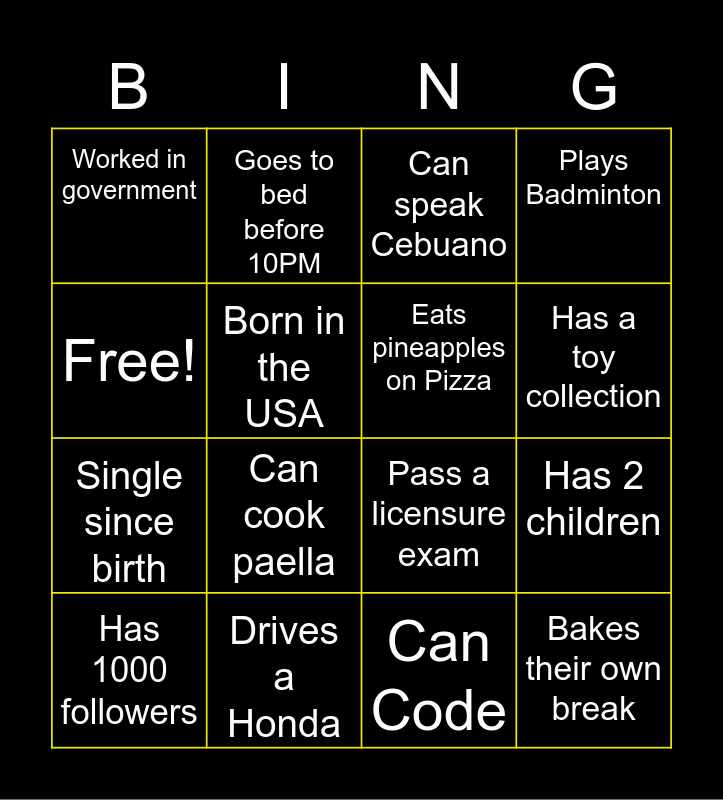 This bingo card has 16 words: Drives a Honda, Has 2 children, Can speak Cebuano, Worked in government, Single since birth, Goes to bed before 10PM, Pass a licensure exam, Can Code, Free!, Born in the USA, Has 1000 followers, Plays Badminton, Can cook paella, Has a toy collection, Eats pineapples on Pizza and Bakes their own break.