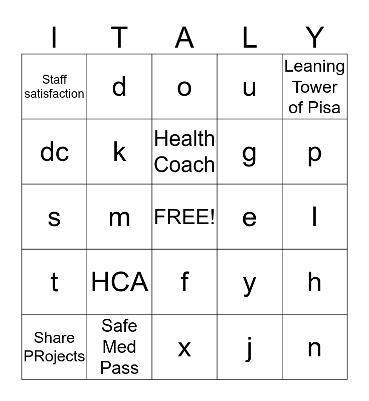 This bingo card has a free space and 24 words: HCA, Safe Med Pass, Health Coach, Share PRojects, Leaning Tower of Pisa, Staff satisfaction, dc, d, e, f, g, s, y, h, k, j, l, o, p, m, n, t, u and x.