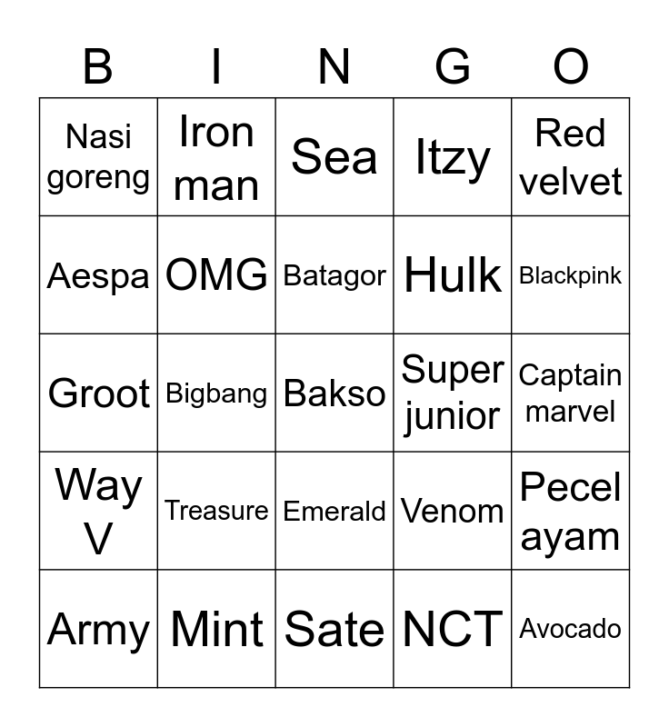 This bingo card has a free space and 24 words: Treasure, Mint, Batagor, Army, Red velvet, Nasi goreng, Aespa, Iron man, Super junior, Emerald, Hulk, Groot, Venom, Pecel ayam, OMG, NCT, Captain marvel, Sea, Blackpink, Bigbang, Avocado, Way V, Itzy and Sate.