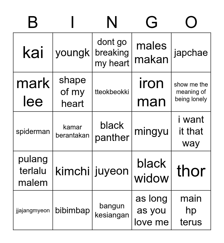 This bingo card has a free space and 24 words: kimchi, bibimbap, tteokbeokki, jjajangmyeon, japchae, kai, mark lee, youngk, mingyu, juyeon, iron man, spiderman, black widow, thor, shape of my heart, as long as you love me, i want it that way, dont go breaking my heart, show me the meaning of being lonely, kamar berantakan, main hp terus, pulang terlalu malem, males makan and bangun kesiangan.