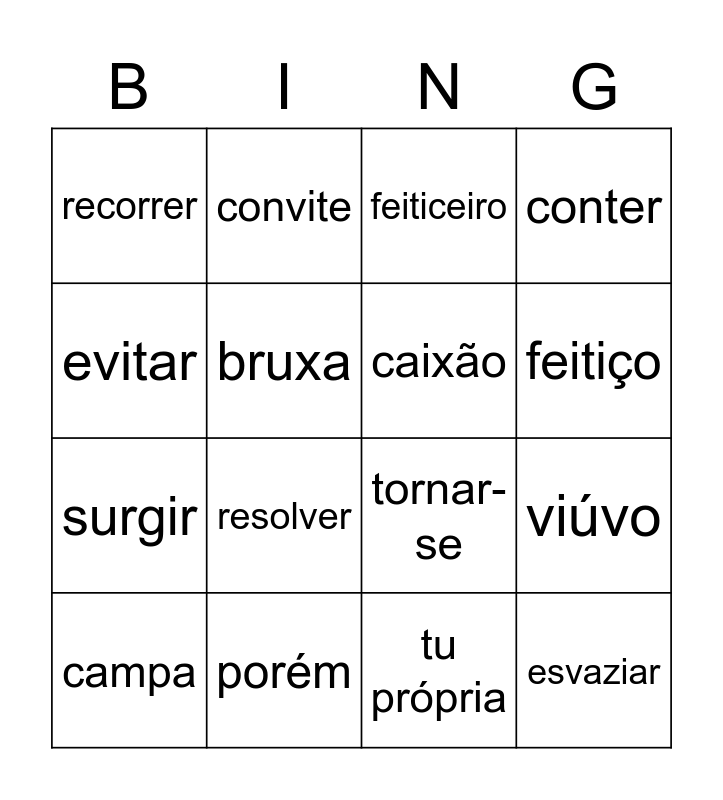 This bingo card has 16 words: porém, viúvo, feiticeiro, recorrer, surgir, convite, tornar-se, tu própria, evitar, bruxa, campa, conter, resolver, feitiço, caixão and esvaziar.