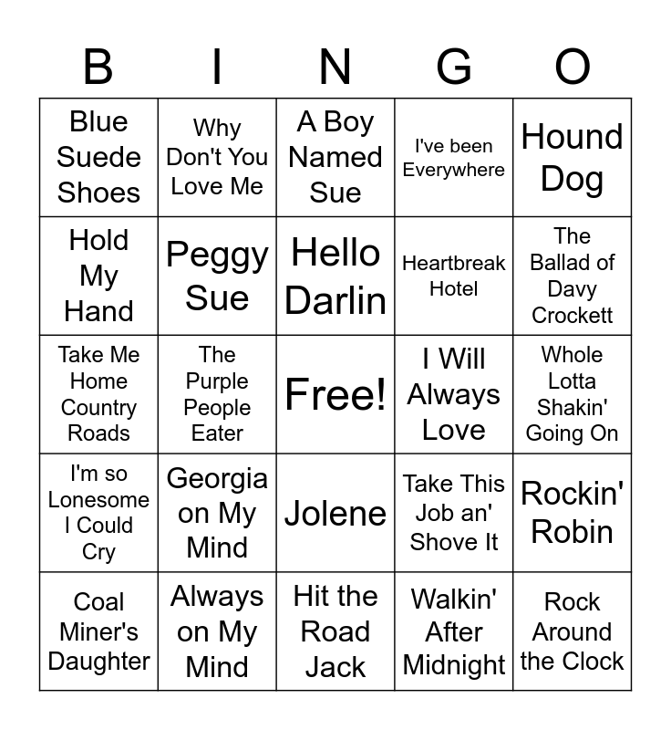 This bingo card has a free space and 39 words: Kiss an Angel Good Morning, Tutti Frutti, The Twist, Peggy Sue, Coal Miner's Daughter, Jolene, Hello Darlin, Harper Valley P.T.A, Hound Dog, I'm so Lonesome I Could Cry, The Purple People Eater, I've been Everywhere, Rock Around the Clock, Whole Lotta Shakin' Going On, I Will Always Love, Georgia on My Mind, He Stopped Loving Her Today, Blue Suede Shoes, That's Amore, Take This Job an' Shove It, Hold My Hand, Hit the Road Jack, Heartbreak Hotel, The Ballad of Davy Crockett, It's Now or Never, Jackson, Friends in Low Places, I Walk the Line, Jailhouse Rock, Why Don't You Love Me, Hey, Good Lookin', Stand By Your Man, A Boy Named Sue, Always on My Mind, Walkin' After Midnight, I Fall to Pieces, Rockin' Robin, Take Me Home Country Roads and The Devil Went Down to Georgia.