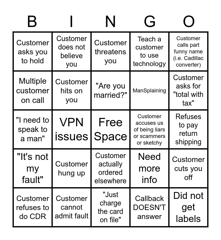 This bingo card has a free space and 103 words: Teams not working, CDR tool is not working, Customer calls part funny name (i.e. Cadillac converter), Customer is STUBBORN, Customer wants replacement on refunded order, Customer does not have order info, Funny customer, Customer keeps repeating the same thing, Customer asks about store in their area, Customer will not stop talking, Customer asking for someone else, Call longer than 10 minutes, Email Address ‘iS aLl LoWeR cAsE’, Customer asks about pick -up option, Customer asks to drop -off return, Customer asks you to look at part, Customer threatens you, Arguing about tow mirrors, Customer threatens legal action, Customer asks for tech/mechanic, Customer asks for more info on part we do not carry, SYSTEM DOWN, Customer asks to tell you card number, "Can I text you a picture?", Cat steps on keyboard, Customer hung up, Customer asks for "total with tax", Teach a customer to use technology, Customer hangs up before you answer, Customer talks over you or interrupts, Need more info, Callback DOESN'T answer, Customer needs to confirm with mechanic or someone else, Customer does NOT listen, "Can you see my cart?", Existing call on New Order line, Same Day Delivery, Mad about ESTIMATED delivery, "Are you married?", Customer cannot admit fault, "I ordered the right parts", "It's not my fault", Customer calls you a pet name, Multiple customer on call, Crazy things in background, Customer asks you to hold, Escalation, Did not get labels, Customer asks for INSANE exception, AWESOME CUSTOMER, "But I saw it online", Signify Cancel, Customer flushes and does not wash hands, Someone calls about applying, Dead air call, Customer sniffs their boogies up, Customer is eating, Customer ordering food while on phone, Customer asks for something else after finishing call, Customer actually ordered elsewhere, Refuses to pay return shipping, We loose a customer, Customer is sexist, Customer did NOT read listing, Contact makes you late for break, Customer refuses to give vehicle info, New Order on Existing Line, Customer does not believe you, "I need to speak to a man", VPN issues, "Just charge the card on file", Customer Cannot use PCIPal, Customer does not understand "NO", PCIPal will not load, "iT sAiD gUaRaNtEeD tO fIt", "Clear Cache and Cookies", Told to watch your numbers, Customer refuses to do CDR, CIT/MAX gets glitchy, "I am a mechanic", Customer says they know what they are talking about but doesn't, Customer is lying, Customer hits on you, Customer mad about damaged packaging, Customer accuses us of being liars or scammers or sketchy, Customer asks for discount, Customer mentions YouTube videos, "You have a video for it", Tries to return order over a year old, "Is that both?", "Are bulbs included?", Customer threatens chargeback, Customer cuts you off, RUUUUDE Customer, Callback - No Answer, Customer curses you out, ManSplaining, Sketchy Customer, Customer doing something gross, Sale on Existing, Double Sale, Customer has monotone voice and Hear yourself echoing in call.