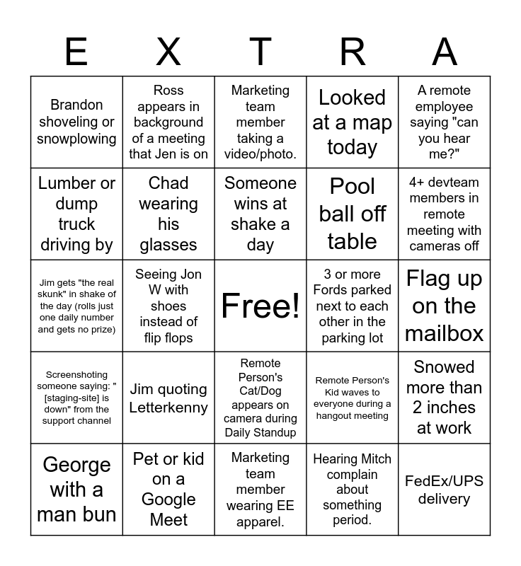 This bingo card has a free space and 38 words: Pool ball off table, Taking stairs two at a time, Marc in the office, Chad wearing his glasses, Snowed more than 2 inches at work, Jim quoting Letterkenny, Someone wins at shake a day, Someone skunked at shake a day, A remote employee saying "can you hear me?", Pool ball off table, Seeing Jon W with shoes instead of flip flops, Looked at a map today, FedEx/UPS delivery, Flag up on the mailbox, Lumber or dump truck driving by, Screenshoting someone saying: "[staging-site] is down" from the support channel, Brian saying "Go Bills", Marketing team member taking a video/photo., Had to wait for a microwave, 3 or more Fords parked next to each other in the parking lot, Brandon shoveling or snowplowing, Pet or kid on a Google Meet, 4+ devteam members in remote meeting with cameras off, George with a man bun, Someone on their phone during the 11:40am huddle, Marketing team member wearing EE apparel., Waving bye after a meeting, Someone wearing a sports themed shirt, Spotting 4 people with EXTRA apparel in one day. Online or in office., Jim wearing Elite EXTRA apparel, Catch Jamie riding the elevator., Remote Person's Cat/Dog appears on camera during Daily Standup, Hearing Mitch complain about something period., Ross appears in background of a meeting that Jen is on, Shake of the day winner!, Remote Person's Kid waves to everyone during a hangout meeting, Jim gets "the real skunk" in shake of the day (rolls just one daily number and gets no prize) and Lumber or dump truck driving by.
