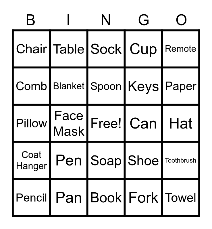 This bingo card has a free space and 24 words: Pencil, Pen, Spoon, Fork, Remote, Chair, Table, Sock, Can, Hat, Pillow, Blanket, Shoe, Toothbrush, Comb, Pan, Book, Cup, Paper, Coat Hanger, Face Mask, Soap, Keys and Towel.