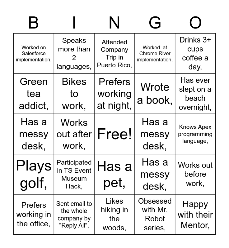 This bingo card has a free space and 80 words: Attended Company Trip in Las Vegas,, Attended Company Trip in Bermuda,, Attended Company Trip in Puerto Rico,, Joined Acquis in 2021,, With Acquis for more than 10 years,, Is a part of the international office,, Is a part of the US team,, Haven’t invited Jeff to a ski trip,, Is a part of ATA Team Abroad,, Is a part of TS Culture Team,, Worked at Concur implementation,, Worked at Coupa implementation,, Worked at Chrome River implementation,, Worked on Salesforce implementation,, Coffee addict,, Green tea addict,, Obsessed with Marketing,, Participated in TS Event Museum Hack,, Participated in Employee Spotlight,, Knows Apex programming language,, Knows how to surf,, Drinks 3+ cups coffee a day,, Has a messy desk,, Prefers working at night,, Bikes to work,, Works out before work,, Is a Mentor,, Was promoted last year,, Hates working from home,, Loves working from home,, Has ever slept on a beach overnight,, Doesn't have a Facebook page,, Likes hiking in the woods,, Prefers remote work,, Prefers working in the office,, Has a messy desk,, Has 0 unread emails,, Won Utilization Contest,, Won Sales Contest,, Happy with their Mentor,, Participated in TS Culture event in November,, 2 years in a company,, 3 years in a company,, 4 years in a company,, 5 years in a company,, Speaks more than 2 languages,, Speaks more than 1 language,, Made a New Year resolution and kept it,, Uses gifs in Slack,, Regularly attends Virtual Acquis Culture events,, Works out before work,, Works out after work,, Has a messy desk,, Has 0 unread emails,, Prefers working in the morning,, Prefers working at night,, Plays the guitar,, Same birth month as you,, Has a YouTube channel,, Has a pet,, Wrote a book,, Jetlagged right now,, Has visited Prague,, Has lived overseas,, Is fluent in another language,, Is lefthanded,, Has lived in another country,, Cat person,, Dog person,, Plays tennis,, Plays golf,, Sent email to the whole company by "Reply All",, Was born in January,, Can play a musical instrument,, Is an only child,, Likes to play rugby,, Obsessed with Mr. Robot series,, Loves cooking,, Walks to work, and Bikes to work,.