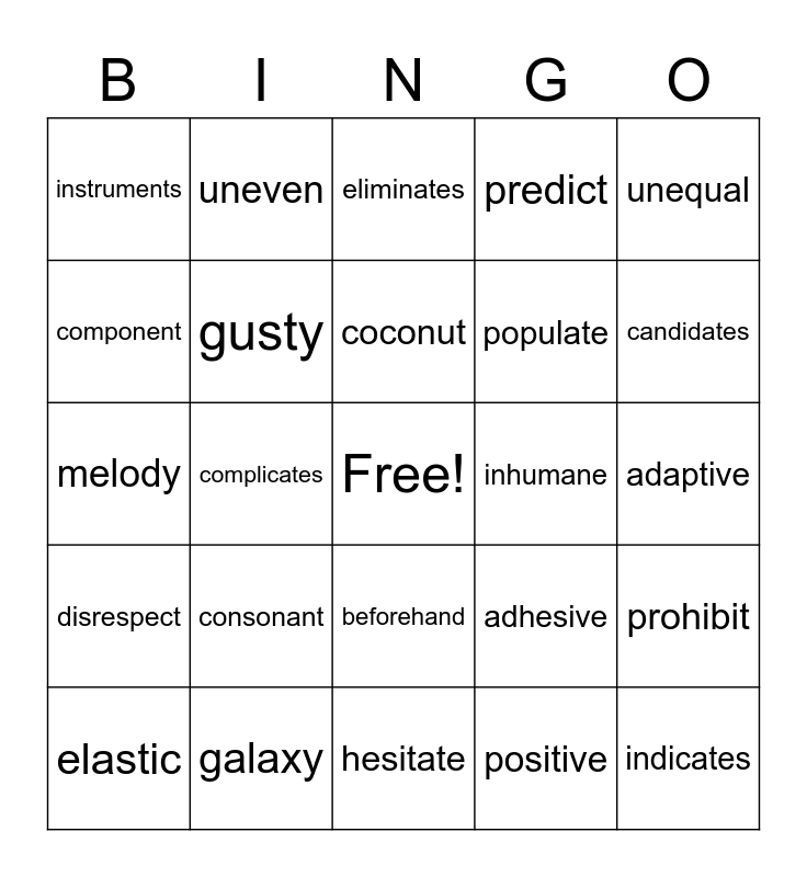 This bingo card has a free space and 24 words: consonant, galaxy, coconut, elastic, unequal, instruments, component, uneven, inhumane, beforehand, populate, melody, adhesive, prohibit, gusty, positive, adaptive, eliminates, candidates, complicates, indicates, disrespect, predict and hesitate.