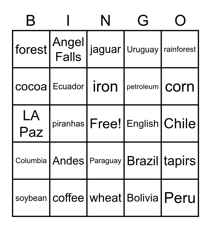 This bingo card has a free space and 34 words: Argentina, Bolivia, Spanish, anacondas, Columbia, Ecuador, rainforest, soybean, Angel Falls, Guyana, iron, jaguar, gold, Incas, English, corn, coffee, LA Paz, Andes, Brazil, Paraguay, silver, forest, Chile, wheat, Peru, Uruguay, Venezuela, petroleum, cocoa, copper, piranhas, tapirs and Portuguese.