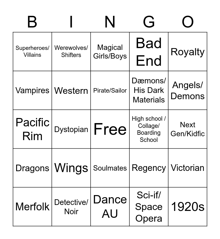 This bingo card has a free space and 24 words: Wings, Detective/ Noir, Pirate/Sailor, Merfolk, Royalty, Superheroes/ Villains, Vampires, Werewolves/ Shifters, High school / Collage/ Boarding School, Soulmates, Dæmons/ His Dark Materials, Pacific Rim, Regency, Victorian, Western, Sci-if/ Space Opera, Next Gen/Kidfic, Magical Girls/Boys, Angels/ Demons, Dystopian, 1920s, Dragons, Bad End and Dance AU.