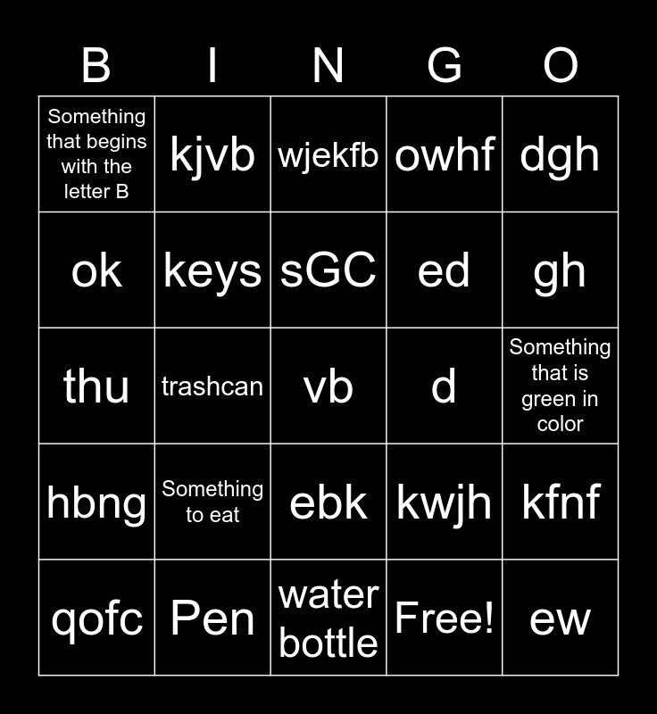 This bingo card has 30 words: Pen, a, trashcan, oke, Something that begins with the letter B, wjekfb, keys, ebk, d, water bottle, Something that is green in color, vb, Free!, ew, gh, ast, kwjh, hbng, Something to eat, dgh, thu, Notebook, kjvb, ed, ok, owhf, kfnf, qofc, sGC and OK.
