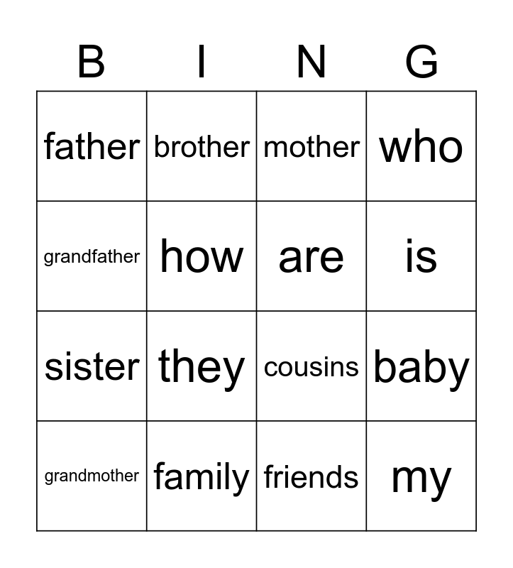 This bingo card has 16 words: family, baby, mother, father, sister, brother, cousins, friends, grandfather, how, grandmother, who, they, is, are and my.