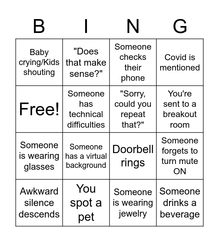 This bingo card has 16 words: You spot a pet, Someone forgets to turn mute ON, Someone checks their phone, Baby crying/Kids shouting, Someone is wearing glasses, "Does that make sense?", Doorbell rings, Someone is wearing jewelry, Free!, Someone has technical difficulties, Awkward silence descends, Covid is mentioned, Someone has a virtual background, You're sent to a breakout room, "Sorry, could you repeat that?" and Someone drinks a beverage.
