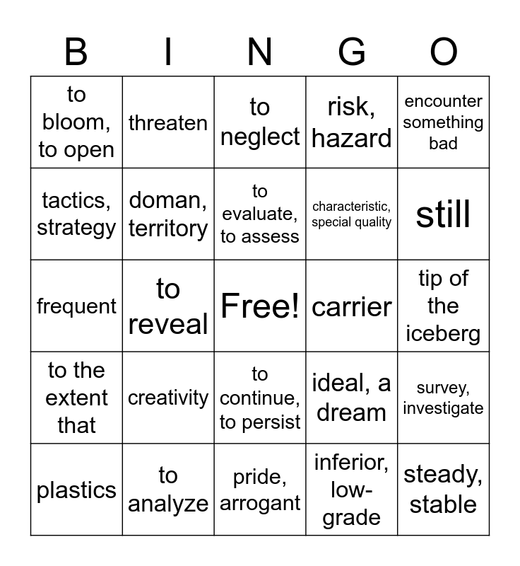 This bingo card has a free space and 24 words: creativity, to analyze, to evaluate, to assess, plastics, encounter something bad, to bloom, to open, tactics, strategy, threaten, carrier, to continue, to persist, characteristic, special quality, frequent, ideal, a dream, survey, investigate, doman, territory, inferior, low-grade, tip of the iceberg, to neglect, still, to reveal, steady, stable, to the extent that, risk, hazard and pride, arrogant.