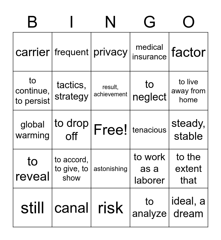 This bingo card has a free space and 24 words: to accord, to give, to show, canal, result, achievement, still, factor, carrier, to continue, to persist, frequent, tenacious, astonishing, to neglect, global warming, to work as a laborer, to the extent that, tactics, strategy, to analyze, steady, stable, privacy, to live away from home, to drop off, ideal, a dream, to reveal, medical insurance and risk.