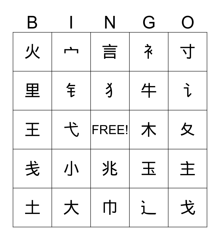This bingo card has a free space and 24 words: 小, 大, 犭, 土, 寸, 火, 里, 宀, 木, 兆, 牛, 王, 玉, 主, 钅, 辶, 夂, 言, 讠, 弋, 戈, 戋, 衤 and 巾.