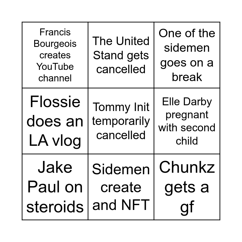This bingo card has a free space and 8 words: Elle Darby pregnant with second child, One of the sidemen goes on a break, The United Stand gets cancelled, Jake Paul on steroids, Francis Bourgeois creates YouTube channel, Chunkz gets a gf, Flossie does an LA vlog and Sidemen create and NFT.