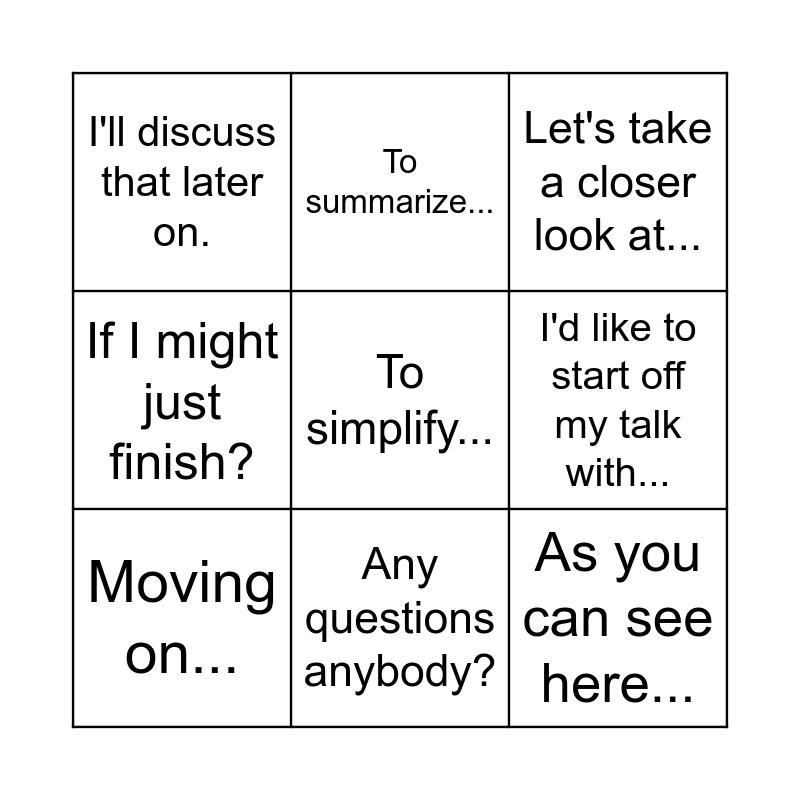This bingo card has 9 words: Moving on..., Let's take a closer look at..., To summarize..., If I might just finish?, I'll discuss that later on., I'd like to start off my talk with..., To simplify..., As you can see here... and Any questions anybody?.