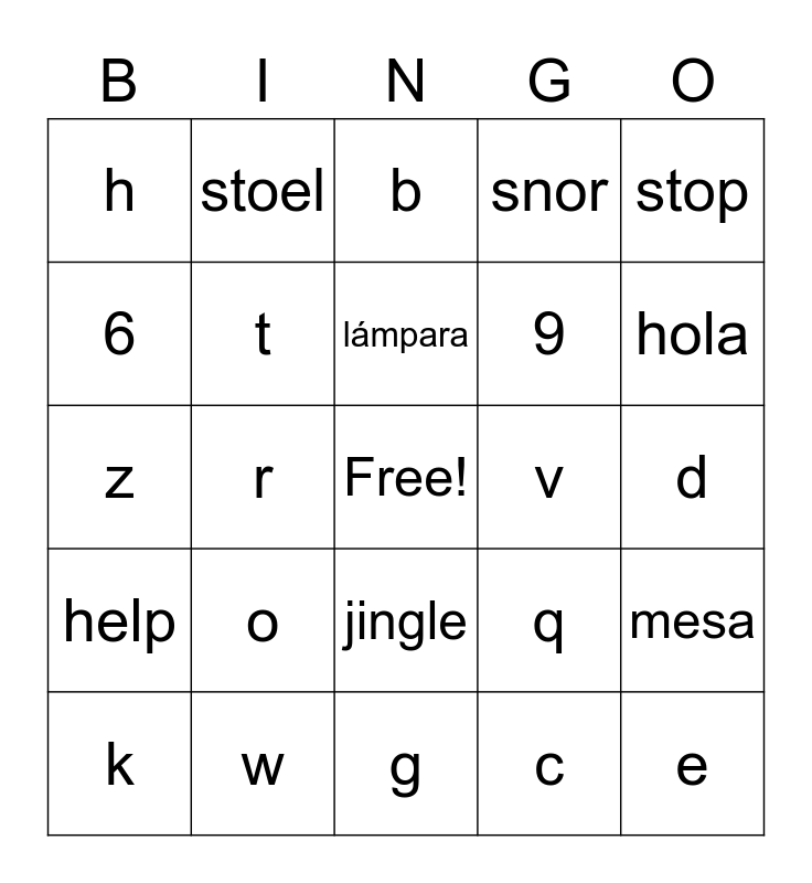 This bingo card has a free space and 29 words: k, a, r, s, h, b, t, o, v, w, d, e, g, c, hola, bingo, jingle, help, stop, z, q, x, 9, 6, snor, stoel, mesa, lámpara and colega.