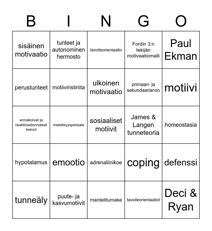 This bingo card has 25 words: emootio, mantelitumake, ulkoinen motivaatio, tunneäly, Paul Ekman, sisäinen motivaatio, perustunteet, tunteet ja autonominen hermosto, James & Langen tunneteoria, adrenaliinikoe, primaari- ja sekundaariarvio, ennakoivat ja reaktiosidonnaiset keinot, coping, defenssi, motiiviristiriita, Deci & Ryan, homeostasia, tavoiteorientaatio, motiivi, mielekkyysperiaate, sosiaaliset motiivit, puute- ja kasvumotiivit, hypotalamus, Fordin 3:n tekijän motivaatiomalli and tavoiteorientaatiot.