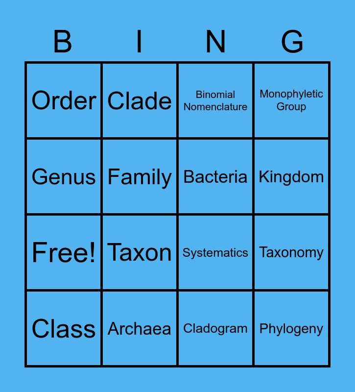 This bingo card has 20 words: Taxonomy, Eukarya, Binomial Nomenclature, Domain, Class, Genus, Archaea, Order, Free!, Clade, Taxon, Systematics, Family, Phylogeny, Bacteria, Phylum, Kingdom, Monophyletic Group, Cladogram and Derived Character.