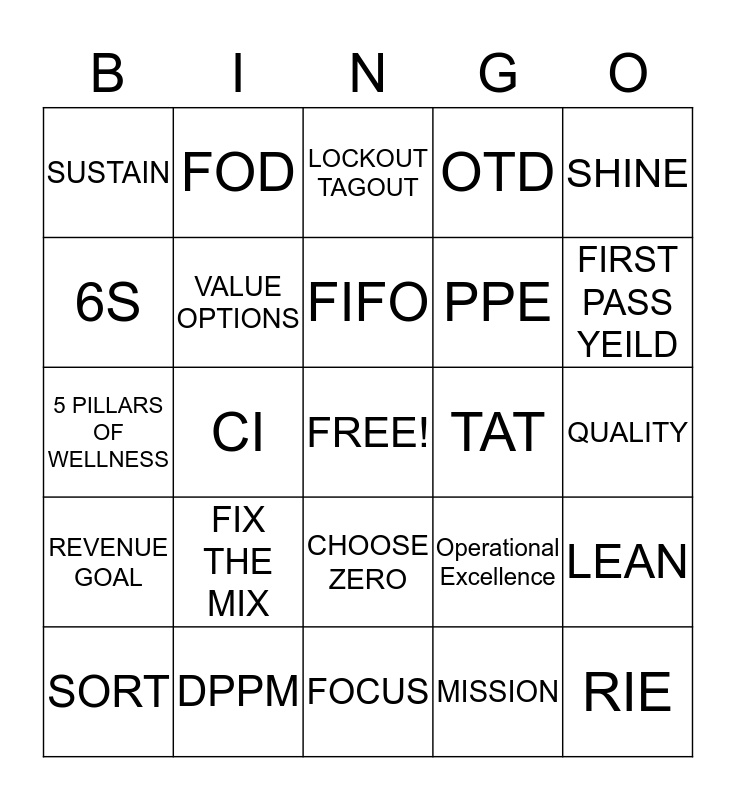 This bingo card has a free space and 24 words: FIX THE MIX, DPPM, FIFO, SORT, SHINE, SUSTAIN, 6S, FOD, TAT, CHOOSE ZERO, PPE, 5 PILLARS OF WELLNESS, Operational Excellence, LEAN, VALUE OPTIONS, MISSION, QUALITY, LOCKOUT TAGOUT, FIRST PASS YEILD, CI, RIE, REVENUE GOAL, OTD and FOCUS.