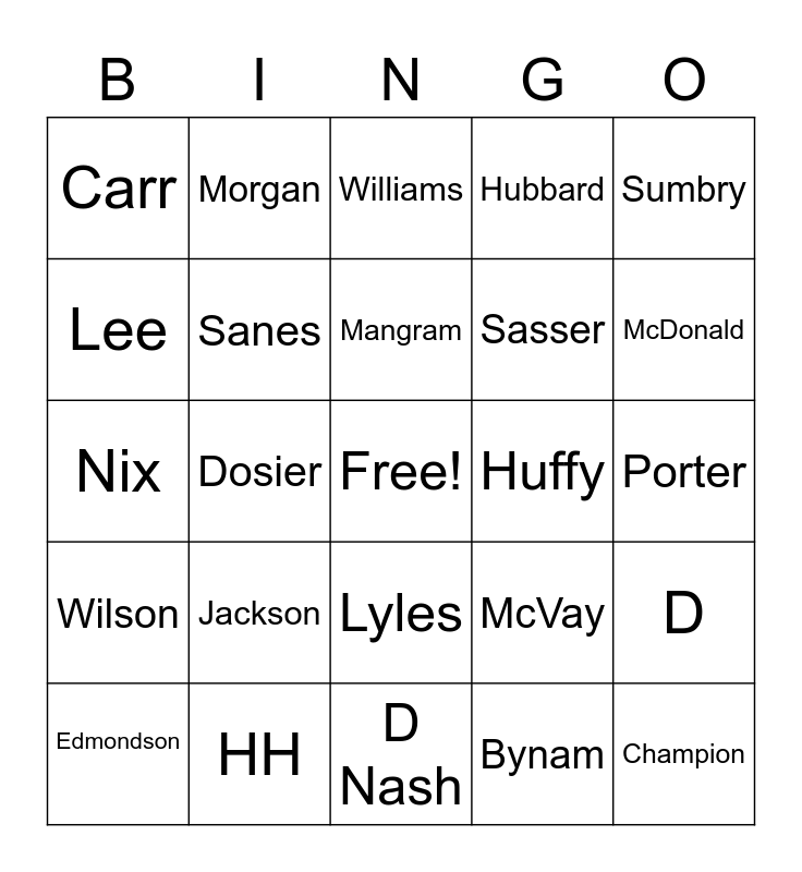 This bingo card has a free space and 39 words: Diggs, Aldridge, Taylor, Sanes, Edmondson, Lyles, Mangram, E Nash, Sumbry, Wilson, Dosier, Hubbard, Champion, Porter, Huffy, Jackson, Mack, Carr, James, McVay, Lee, D Nash, Sasser, McDonald, Medley, Miles, Smiley, Cassidy, Hartman, Morgan, Jordan, Miller, Williams, HH, Bynam, Thompson, D, Nix and Sherrer.