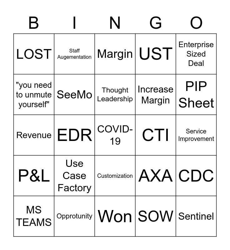This bingo card has a free space and 24 words: Use Case Factory, Opprotunity, Thought Leadership, MS TEAMS, Enterprise Sized Deal, LOST, "you need to unmute yourself", Staff Augementation, CTI, Customization, Increase Margin, Revenue, AXA, CDC, SeeMo, SOW, Service Improvement, Margin, PIP Sheet, EDR, Sentinel, P&L, UST and Won.
